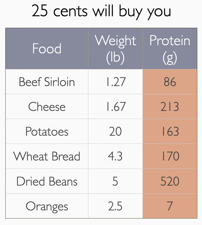 You couldn’t buy big tubs of whey isolate in 1887, and the table above lists some potential alternatives for the protein-conscious. Each quantity of food could be purchased for 25 cents in 1887 dollars.2 If price and protein were the only concerns and intestinal distress could be dismissed, a person would eat nothing but beans.