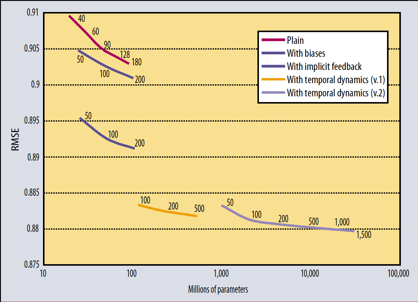 And in the Netflix Prize, the first big public machine learning leaderboard competition, here’s a plot from Bell and Koren on how the more parameters they added to their model, the better their performance was.