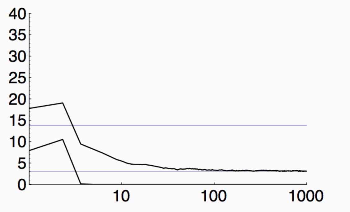 The thing is, I’ve mentioned this before, but we have had plenty of evidence before deep learning that the religious rules I began this blog with aren’t true. Boosting advocates noted in the 1990s that boosting performance kept getting better well after the training error was zero. Here’s a plot from a 1998 NeurIPS tutorial by Peter Bartlett, the bottom curve being boosting train error, the top curve boosting test error: