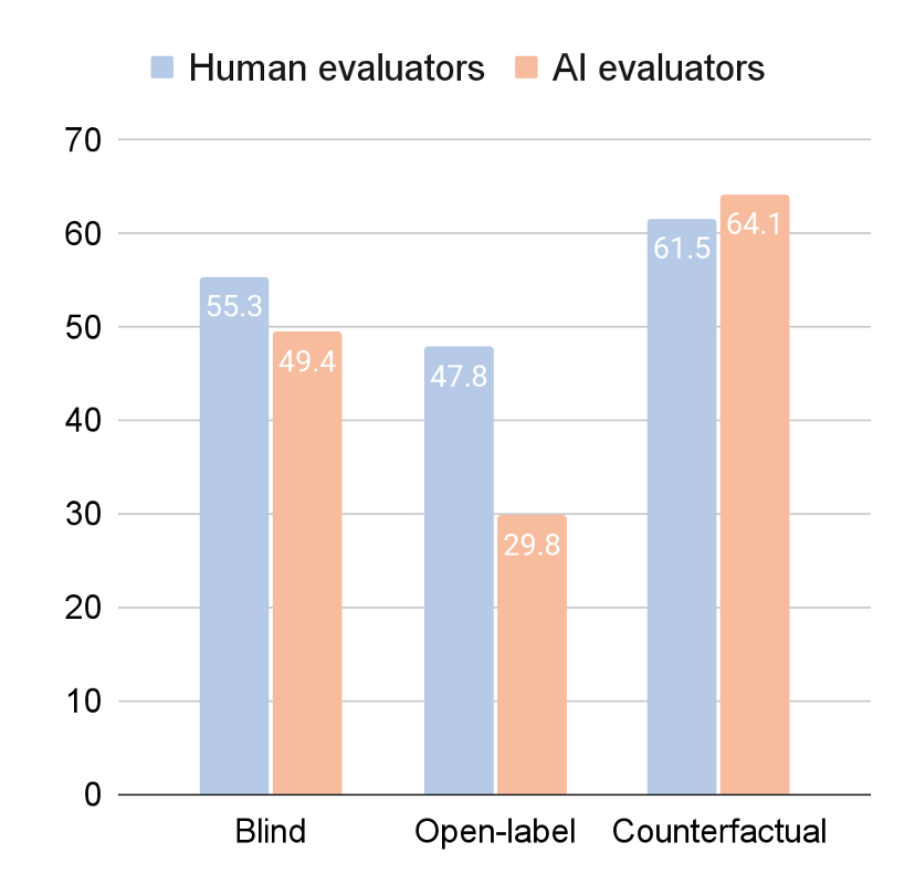 What happened next was entirely predictable. Without attribution of authorship, the “people” on Prolific slightly preferred the AI version, choosing the AI 55% of the time. There were 186 participants and 930 pairwise judgments, so statistical tradition would spew out a confidence interval somewhere between 3 and 7 percentage points wide, depending on the pedantry of Reviewer 2. Make of that what you will. On the other hand, with the correct labels, “people” only chose the AI 48% of the time. Most hilariously, when the labels were swapped, “people” chose what they thought was human 62% of the time.