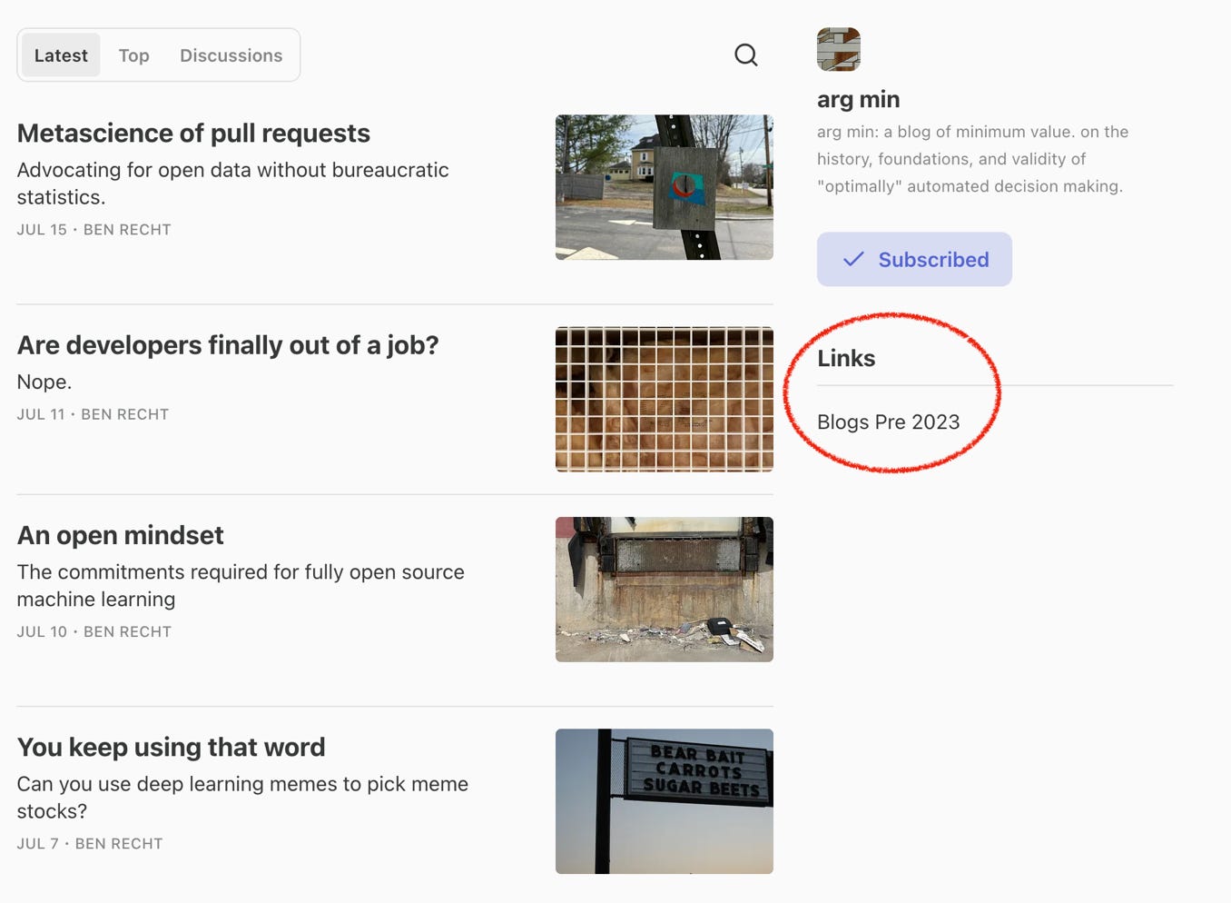 With Google’s abdication of web indexing, your humble blogger is left to index their archives themselves. Dear reader, I’m terrible at this. If only you could see the horror of my Google Docs folder. I periodically force myself to collect draft documents in the hope that this archiving will be useful for later final projects. This blog, which I consider a public repository of first drafts, is no exception. If you use the Substack app or only get argmin by email, you probably never see the doors to the archives. But since I was trying to collect my posts this week, I thought some of you might enjoy a tour.