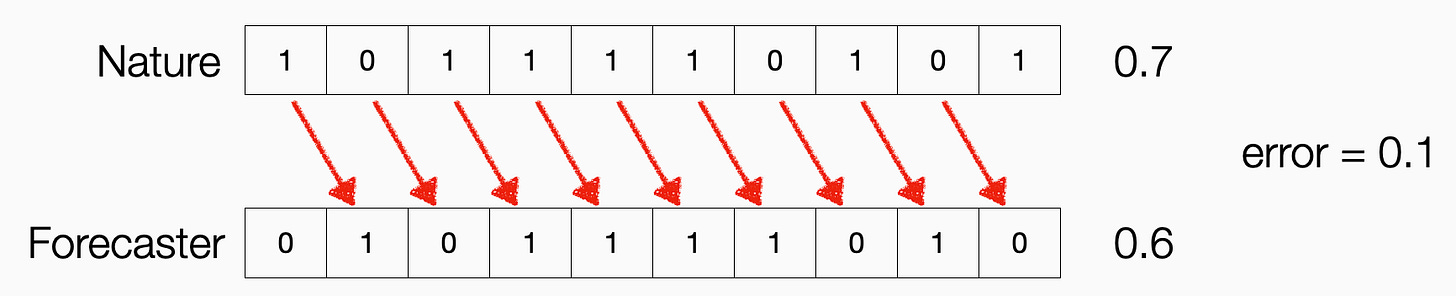 Juanky and I describe how, in most setups people use, this is indeed the case. You can make predictions by correcting past errors. Figuring out which prediction to make can be reduced to a simple binary search problem. And these simple searches that correct past errors achieve theoretically optimal bounds based on the information gathered during play. If you know how you will be scored and what your competitors will be using to make predictions, you don’t have to “know what nature is going to do” to be a superforecaster. You can get good prediction scores just by correcting your past errors.
